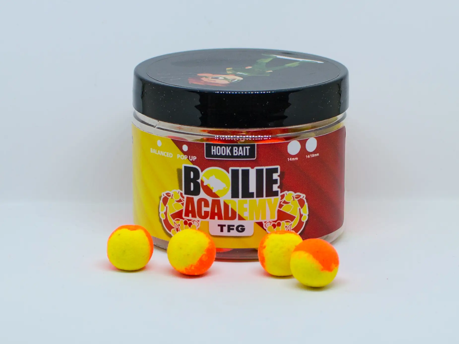 Pop-Up-Boilie – neben der charakteristischen fluoro-orangen und -gelben Farbe enthält sie das vollständige Food-Signal der Boilie.